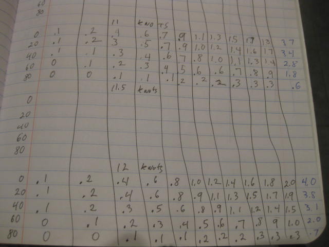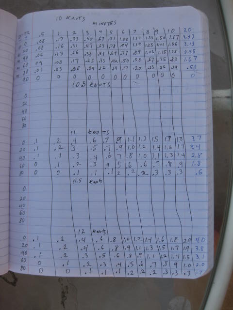 On my recent Atlantic crossing I wanted to take sights and produce fixes that were as accurate as possible in order to gather data on celnav accuracy. It is common practice to ignore the movement of the ship during the time period needed to take a round of sights but since the ship was sailing at ten to twelve knots I decided that I would take this movement into account and advance the lines even for short periods. At twelve knots the ship moves one nautical mile every five minutes, one-tenth of a mile every thirty seconds. After using the marine practice and doing this graphically a few times I decided to switch to flight navigation practice and account for the movement of the ship by mathematically adjusting the LOP. I wrote about this before in discussing flight navigation so go to the following links to those prior postings for a complete discussion of how this is done. But since the Motion Of Observer (MOO) tables in H.O. 249 are for much higher ground speeds I had to create my own such tables for use on the ship. Attached are three photos of the table I created. The top of the table is for a speed of ten knots. Across the top is minutes that the LOP should be advanced. I had planned to compute values for each half knot but decided that such precision was not necessary so I only did the computation for whole knots, 10, 11 and 12.