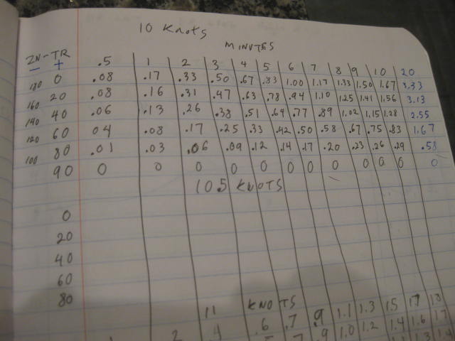 I first computed the data for ten knots. The first two columns list the relative azimuth (ZN-TR) of the LOP to be advanced. I selected an interval of 20 degrees, 0, 20, 60, 80 and 90 for bodies ahead of the vessel with a plus sign (+) and 100, 120, 140, 160 and 180 for bodies behind the vessel with a minus sign (-) for applying the adjustment to sextant altitude. The values for 90 degrees are always zero so I omitted this for the other speeds. I also decided that the values I calculated for ten knots to one-hundredths of a minute of arc was gilding the Lilly so only listed them to one-tenth of a minute for the other speeds. The computation is easy. For 0 and 180 relative azimuths the adjustment is simply the distance covered by the ship during the period of time. For other relative azimuths you simply multiply the full value by the cosine of the relative azimuth.