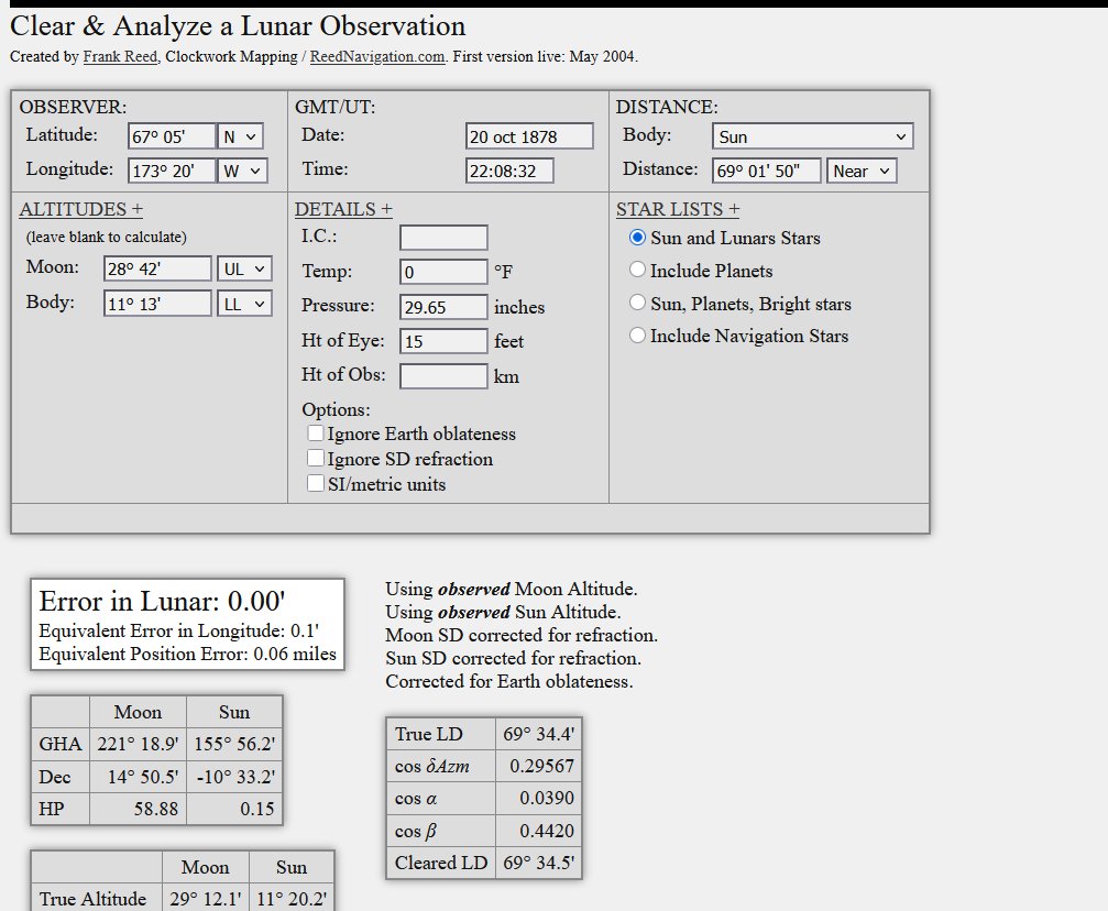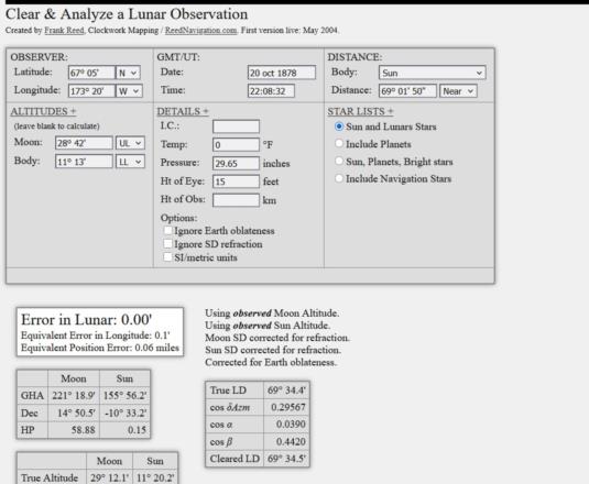 Lars, you mentioned using "contemporary methods" to work this lunar. We could consider that next, but it's tough to decide since in this late era, decades after lunars were "commonly" used at sea, the actual lunar clearing math would depend on the background and preferences of the navigators themselves. Did they have a copy of Norie's Navigator maybe? Was it a very recent edition because they wanted the latest and the best? Or might it have been the captain-navigator's copy from thirty years earlier, worn and beaten but trusted? In any case, I'm convinced it's a good idea to get the numbers right using modern tools first.