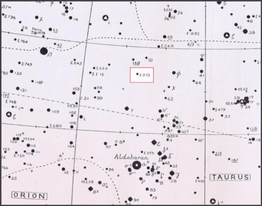 I spotted this pretty photo of a crescent moon with bright earthshine two days ago and got permission to borrow it this morning from the observer. For a "DR" starting point, I only tell you that the photo was taken from somewhere in the western hemisphere. The date and time: 29 April 2025, 02:58:19 UT. As with any case of measuring "lunar distances", we do need to be able to identify the stars we use. In this photo, the relatively bright star above the Moon is a star that has been catalogued as a double since at least 1822. It is "Σ 572" (That's sigma for "Struve" and without the Greek letter, it's also listed as STF 572). Here's an online entry with details on its binary nature: Σ 572 at stelledoppie.it. I'm including a small capture from a portion of chart 5 in the original edition of Norton's Star Atlas from 1910 (available in high-resolution at archive.org, by the way). I have highlighted Σ 572 mostly to illustrate how long this star has been known and studied, despite being only about magnitude 6.5. The fainter star to the right of the Moon has the variable star id "V833 Tau". Here's an online entry with details on this second star: V833 Tau at SIMBAD. You don't need the details if you search for these in "Stellarium" but the details do include alternate designations (like SAO, HIP, HD, Gaia catalog numbers) which can help confirm that you have the right stars. Note that some of the "stars" in the original image are just hot pixels.