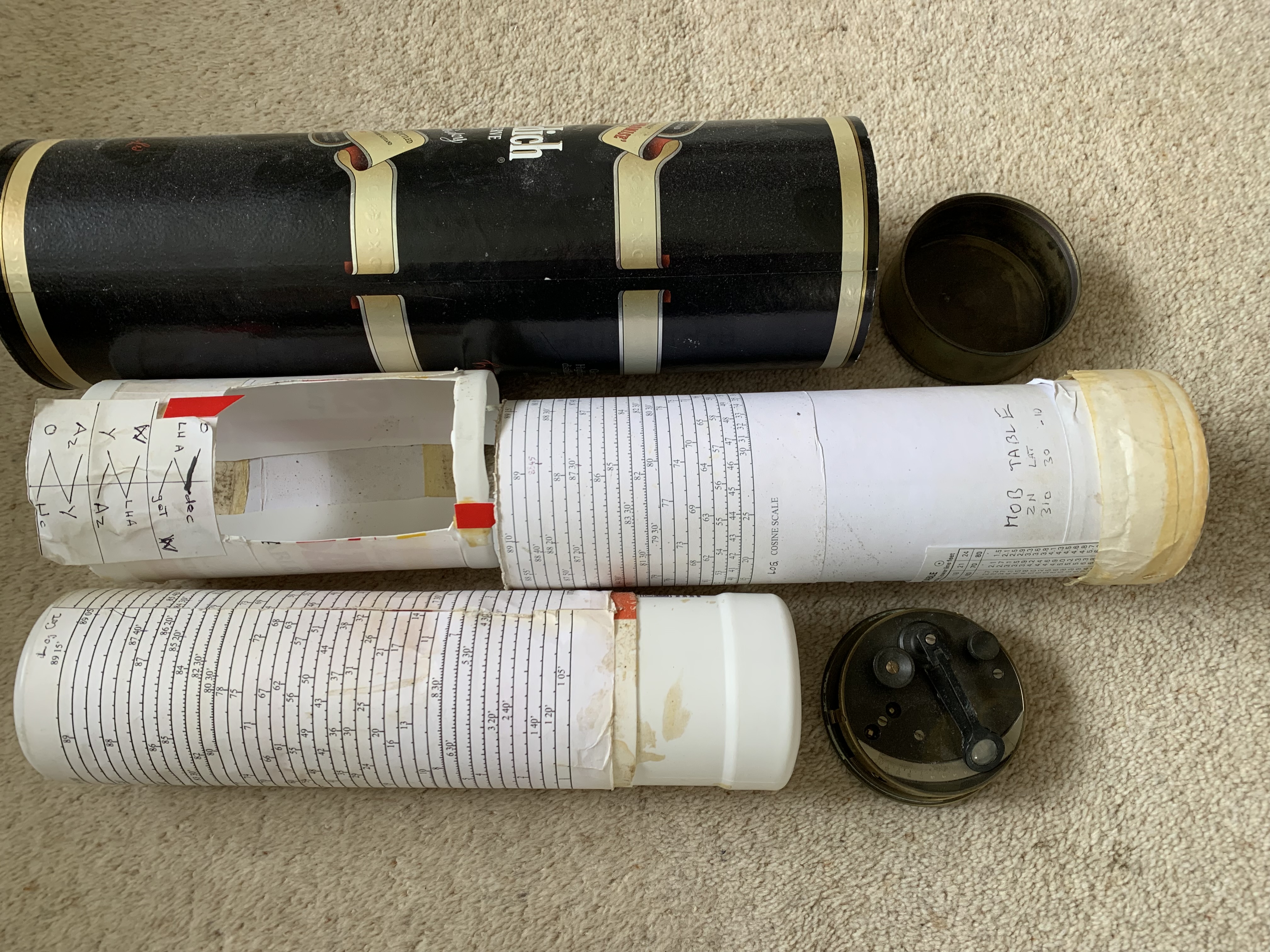 This Bygrave fits inside a whisky bottle container, together with a box sextant, and any amount of work sheets and other stuff.