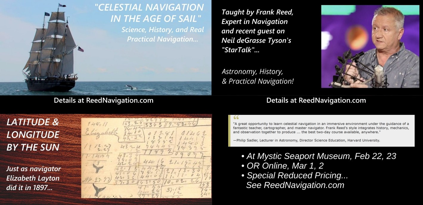 Please note that I'm offering online workshops at a lower price for a limited time (only through the end of April). Next up is Celestial Navigation in the Age of Sail. Details at ReedNavigation.com. The workshop on-site at Mystic Seaport this coming weekend is very close to our capacity limit. Still plenty of seats open for the online session, scheduled for March 1-2.