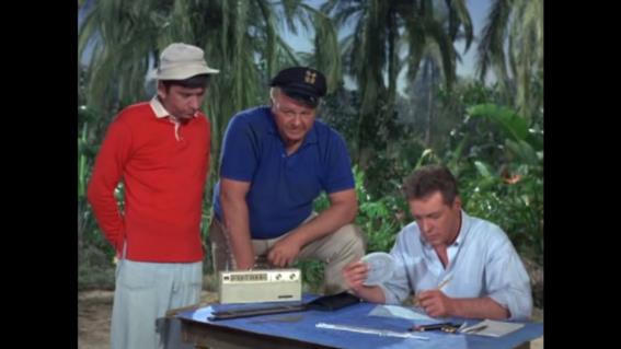 I wouldn't want our sliderule enthusiasts to feel left out, so I'm adding two bonus screen captures. A few years ago on a Yahoo sextants discussion group, someone proposed a hypothetical scenario: if you were stuck on a desert island, specifically if you were the "Professor" on Gilligan's Island, what would be your choice for a sliderule to have with you in your carry-on baggage for the "three-hour tour"? This was all "hypotheticall speaking", of course. And here we see an excellent example of amateur sleuths failing to consult the primary source evidence!! There were sliderules in episodes of Gilligan's Island! The Professor did, in fact, bring sliderules with him, and we see them plainly on-screen.