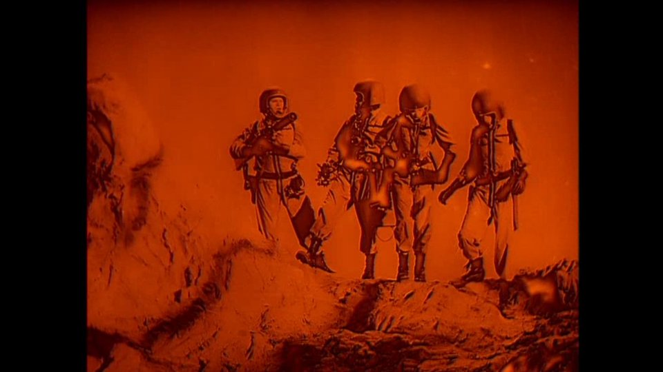 There's a so-bad-it's-good "B movie" called The Angry Red Planet made in 1960. As our martian explorers recover from their battle with a giant bat-spider puppet thing, they come upon a great inland sea. And naturally one of them has remembered to bring a sextant. It's in the right hand of the astronaut second from the left in the screen capture below. See it? In the film, it's much more obvious that it's a sextant, but even in this still screen capture you can make out the micrometer and other components. Later he even raises it to his eye, as if he's using the telescope to get a view of the fabulous city on the opposite shore.