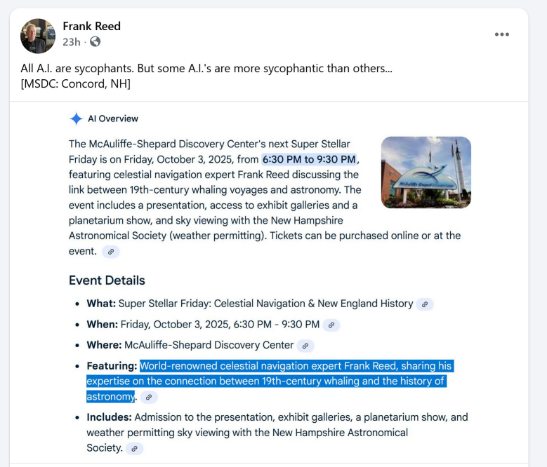 Also if anyone feels like heading to Concord, New Hampshire tomorrow evening, I'm doing a history-focused "popular" presentation on "Celestial Navigation and New England History" at the McAuliffe Shepard Discovery Center. My portion of the evening is one hour starting at 6:30pm. Funny AI-summary attached!