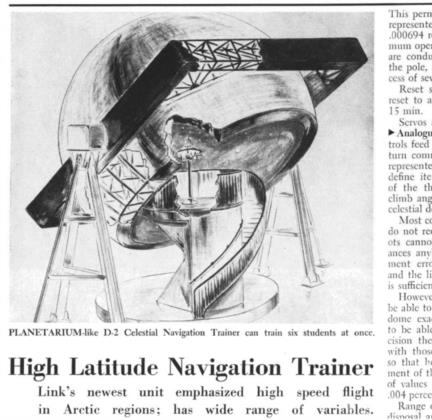 Here's a sketch from the December 25, 1950 issue of "Aviation Week" showing Link Aviation's "D-2 High Speed, High Latitude Celestial Navigation Trainer". The drawing does not immediately convey the size of the thing until you realize that those are stairs spiralling up into the interior of the dome. This is a planetarium dome on gimbals. Its diameter, 30 feet, is comparable to the planetarium dome at the Treworgy Planetarium at Mystic Seaport, which quite a few of you have visited. This machine weighed 22 tons.
