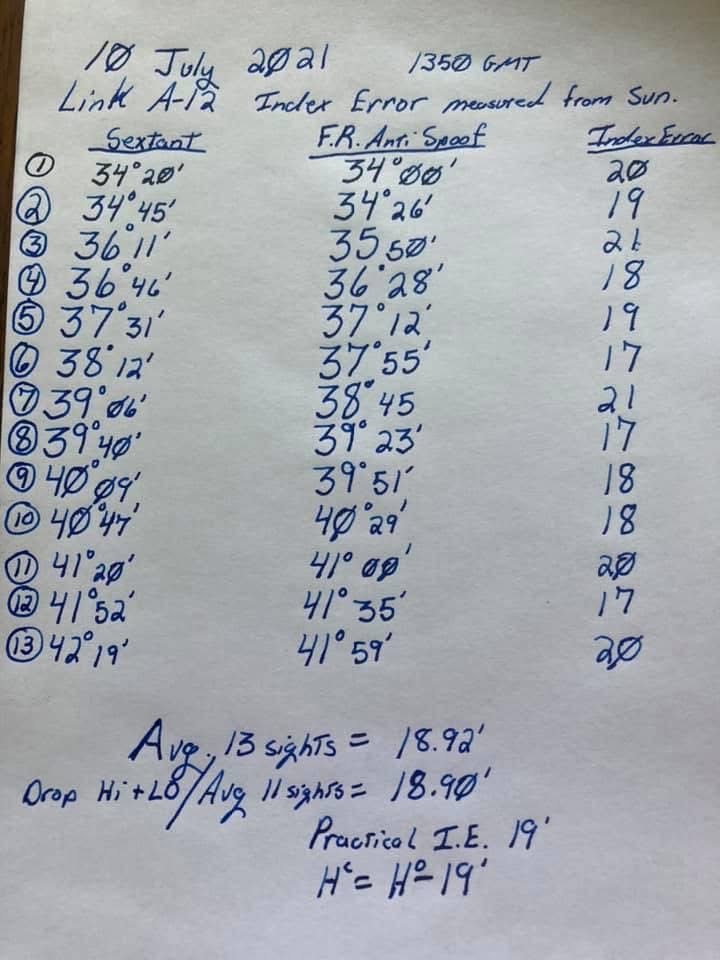 I've never attempted to measure arc error on any of my sextants but I am including an example of raw data to measure index error on a Link A-12 Sextant. It is non trivial to zero out the index error on this sextant, I use Franks Anti Spoof app to meaure the error and live with what I get. The first image is the direct sextant sights compared to the Anti-Spoof app and my determination of correction. The second image is a couple sets of sights used to determine positon with that sextant and correction. The A-12 uses a vernier scale just like the MkIII.