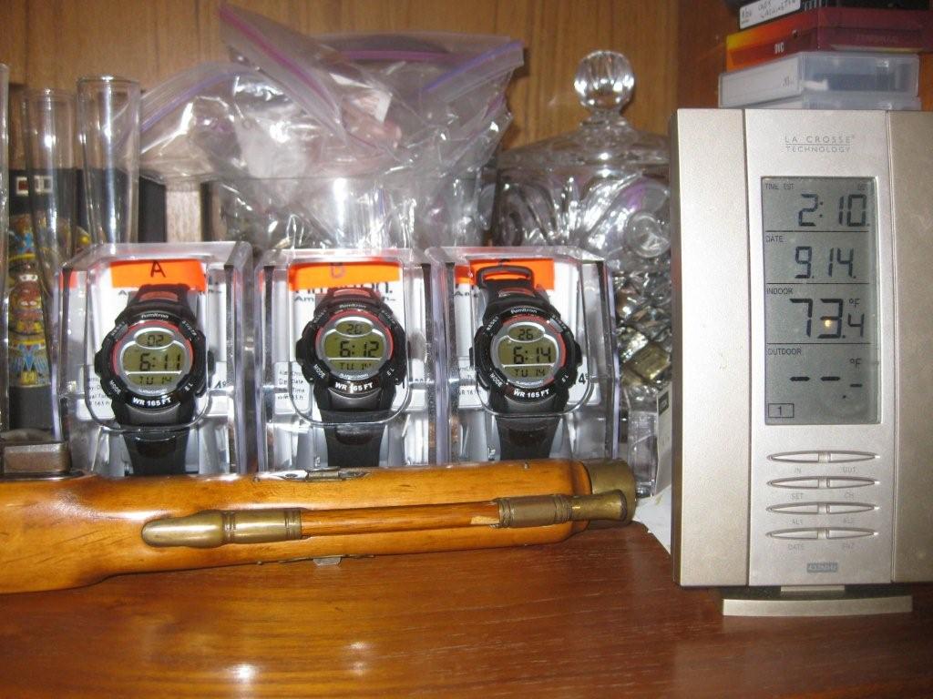 Here is the photo. gl On 9/14/2010 3:06 PM, Gary LaPook wrote: > A year ago in September 2009 we discussed using cheap digital watches > as chronometers in the thread "How many chronometers?" I described an > experiment I was doing using three cheap ($17.00 each) watches to > determine how useful they would be as a chronometer. ( I have provided > links to some of my posts in that discussion below.) > > The experiment has continued now for almost a year and this is an > update to the prior posts. > > Since I had modified the test conditions temporarily to see what > effect very cold temperatures would have on the rates of the watches, > I had to restart the experiment on September 18, 2009, 360 days ago. > The three watches, "A", "B", and "C" were, respectively, 7, 31 and 60 > seconds fast at that point. I had computed their daily rates to be > .1919, .3737 and .6263 seconds per day respectively. The watches are > kept in a cabinet with a minimum-maximum thermometer (see photo) and > the temperature range was 62.5° to 82.4° F ( 16.9° to 28.0 °C.) > > I have checked the watches on five occasions by comparing them with > the radio time signal from WWV and estimated the time to the nearest > half second. Using the daily rates, I predicted what the accumulated > errors should be and compared them with the actual error and the > difference would have been the error if relying on the predicted > errors for navigation. > > The first occasion was on November 13, 2009, 56 days after the start. > In the format for A, B, and C in seconds: actual error; predicted > error; difference. > > A = 17.0/17.7/-.7: B = 52.0/51.9/ .1: C = 95.0/95.1/ -.1 > > Averaging these differences equals -.2 > > > December 31, 2009, 104 days: > > A = 26.5/27.0/ -.5: B = 70.0/69.9/ .1: C = 124.0/125.1/-1.1 > > Averaging these differences equals -.5 > > March 16, 2010, 179 days: > > A = 41.0/41.3/-.3: B = 97.0/97.9/ -.9: C = 172.5/ 172.1/ .4 > > Averaging these differences equals -.3 > > June 23, 2010, 278 days: > > A = 61.5/60.3/1.2: B = 134.0/134.9/ -.9: C = 232.0/234.1/ -2.1 > > Averaging these differences equals -.6 > > September 13, 2010: > > A = 79.0/76.1/2.9: B = 164.0/165.5/ -1.5: C = 281.0/285.5/ -3.5 > > Averaging these differences equals -.7 > > Evaluating this data shows that the greatest difference between > predicted time and actual time was 3.5 seconds after 360 days which > would result in less than one minute of longitude error in almost a > year. So using any one of these watches as a chronometer would provide > sufficient accuracy for celestial navigation. > > Averaging the three readings resulted in a maximum difference of .7 > seconds which would provide a longitude to an accuracy of less than > one-quarter of a minute. > > So it appears that if the watches can be kept in the cabin where the > temperature can be maintained at a comfortable temperature for the > occupants, 17° to 28° C, that these three $17 watches are all you need > for a year of voyaging without recourse to a radio time signal. > > gl > > Check out these previous posts: > > > http://www.navlist.net?i=109724&y=200909 > > http://www.navlist.net?i=109757&y=200909 > > http://www.navlist.net?i=109766&y=200909 > > http://www.navlist.net?i=109824&y=200909 > > http://www.navlist.net?i=109825&y=200909 > > http://www.navlist.net?i=109847&y=200909 > > http://www.navlist.net?i=109894&y=200909 > > http://www.navlist.net?i=109942&y=200909 > > > >