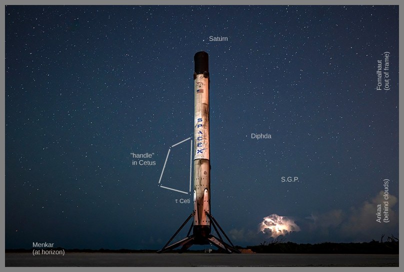 The second feature that I find useful in Cetus is a large "teapot handle" about 10° across consisting of tau, eta, theta, and zeta Ceti. The shape closely resembles the handle of the popular "teapot" asterism in Sagittarius which is made from the stars tau, zeta, phi, and sigma Sagitarii (the latter is "Nunki"). The handle in Sgr is about 5° on its long side, while the "handle" in Cet is 10° on the long side. Notice in the photo that the long side of the "handle" happens to be resting vertically against the side of the rocket. You could grab it and pick it up! See the marked-up image below.