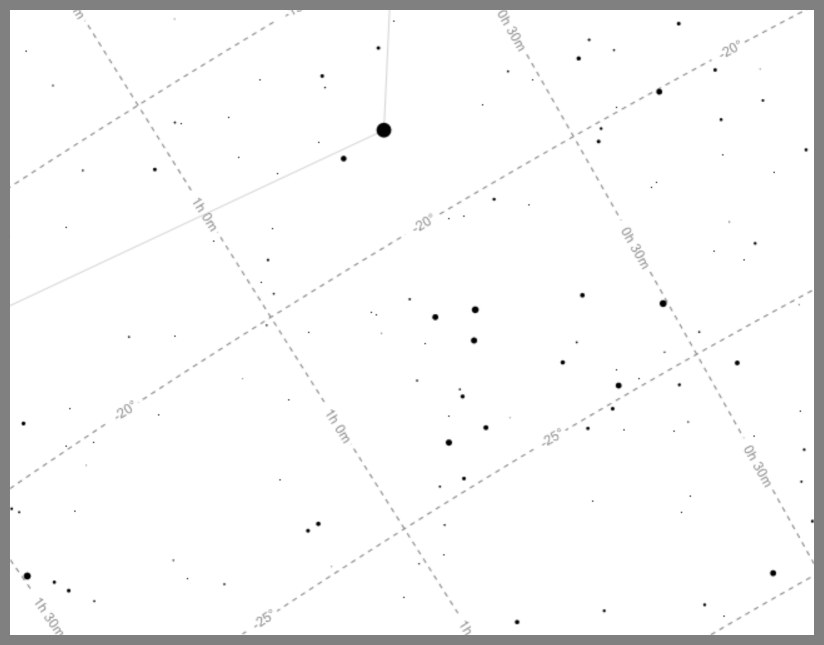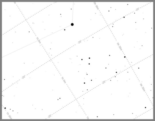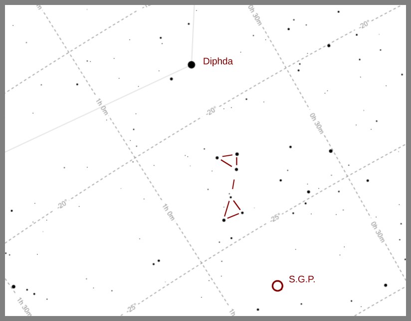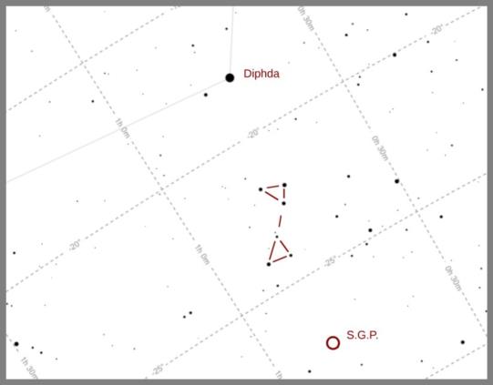 The constellation Cetus is difficult to spot since it has no bright stars and few recognizable "patterns". But there are two patterns that I have found familiar and useful over the years. There's a pair of relatively faint, small, nearly equilateral triangles quite close to Diphda. These "jump out" in some photos, including this one --once you get to know them (and I don't expect anyone else to know them yet, but, as I said, for me, this was the key to puzzling out the star field). This pair of little triangles is useful both for identifying Diphda and for finding the "SGP" or "South Galactic Pole". See the images below.