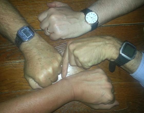 Here is my best effort to match wrists with watches. Given is that Frank isn't wearing a watch on his left hand (pocket watch or right hand wear possible). If the presentation was from 7pm to 9 pm then having a few beers at 10:26pm would be expected which leaves the blank casio digital watch of Herbert's as the watch set to UT (was it really blank?or did the camera shutter snap between blinks). The old timex digital must belong to Stan since we know Richard upgraded from a casio. Richard's upgrade is a TISSOT analog which I believe has a very nice ETA mechanical movement inside.