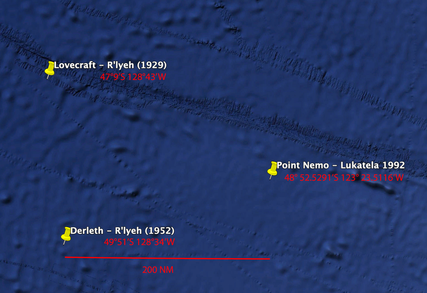 So how did an obscure writer of weird fiction living an a garret in Providence R.I. calculate his point to within less than a degree of Point Nemo 60+ years before Lukatela? Perhaps he had a friend in th Physics/Astronomy dept at Brown?