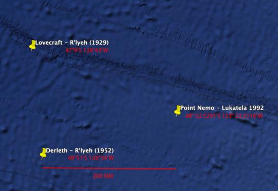 Then in 1952, Lovecraftian writer August Derlith placed R’lyeh close to the two other points. I've attached a jpg I worked up from Google Earth showing the three points, below.