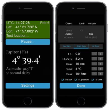 How do you test your observing skills and your sextant using my app? First, you need to decide that you are in a regime where you "Trust the GPS" (see my outline and advice on the app here: ReedNavigation.com/GPSantiSpoof/ ). Next hit the Settings menu and enter a few details. What object are you looking at? Select an appropriate limb and horizon type. What is your height of eye? The selectable heights might seem odd (...17.9, 18.8, 19.6, 20.6... in feet). Why those numbers? Decide on a delay. I suggest ten seconds since most navigators can learn to count to ten in seconds, and that's a reasonable amount of time to get to the app and press "pause". Enter your index correction (I.C.) if any. Adjust the temp and pressure if you need to (these weather data, Wx, are picked up from the internet if possible, but you may prefer to enter them manually). Then you're all set.