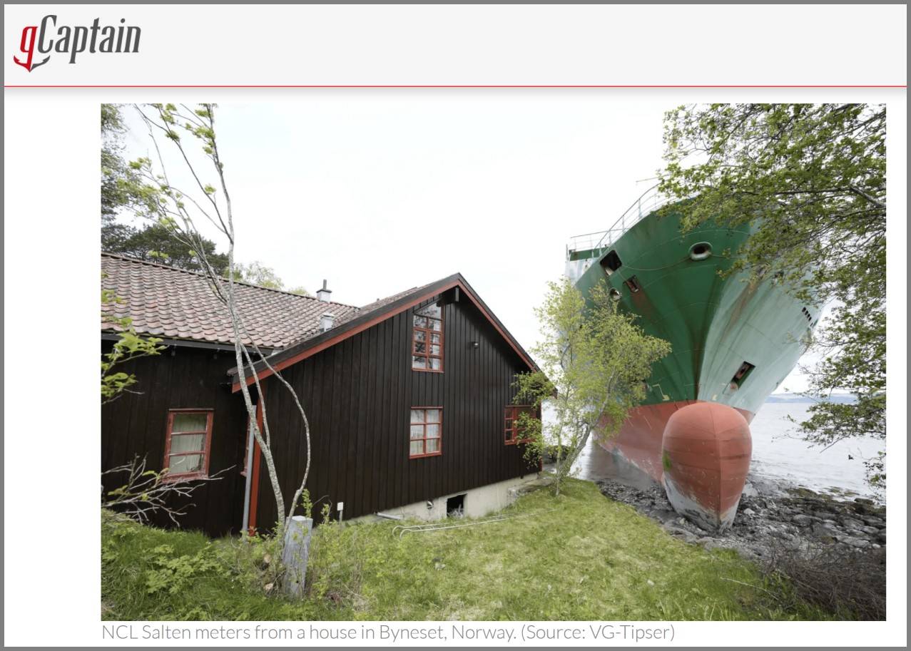 I recall seeing a fairly similar photo of a soft, but "photogenic" (!), grounding of a large cargo vessel in a twisty, craggy Norwegian fjord just a few years ago. Seems like a job for robots to me...