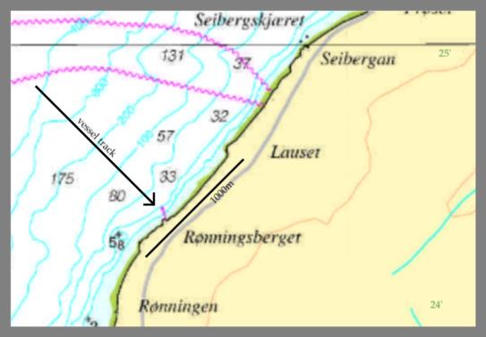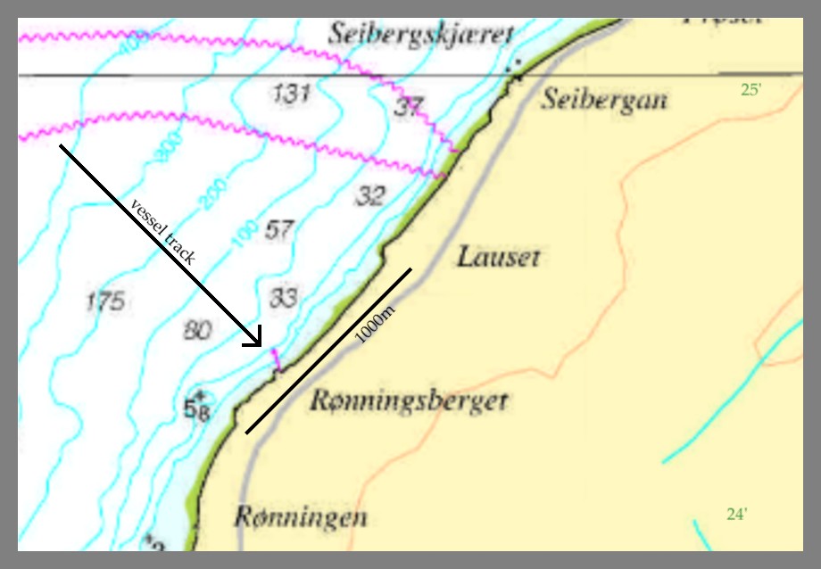 Given the depth contours on the chart and measuring a distance along the shore, it's apparent that the slope of the bottom here is about one in five. The 100m depth contour is about 500m from shore. Assuming that average slope applies, corresponding to a tilt of about 11°, and assuming a hard enough bottom (hard clay?) yet also without any local obstacles that are too hard (boulders!), then the vessel could ride up onto shore safely below my suggested limits in my first post, and again that's consistent with no reported injuries among the crew. The deceleration could have been on the order of 0.1g with that slope.