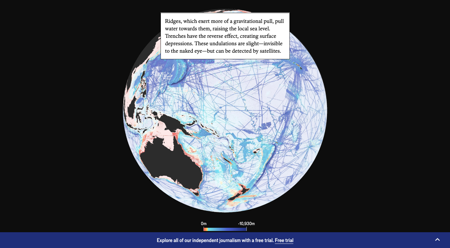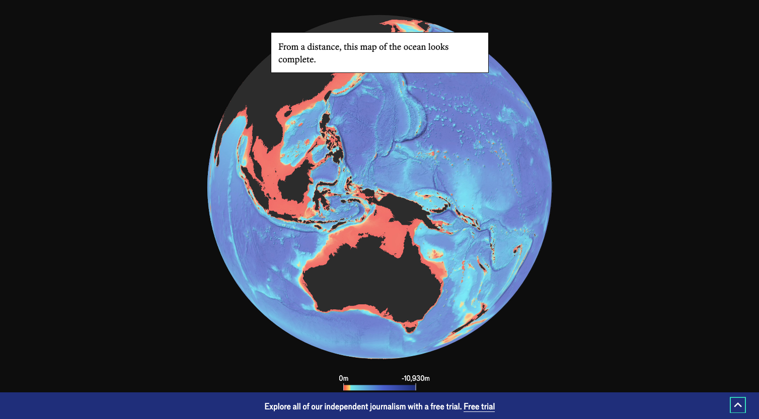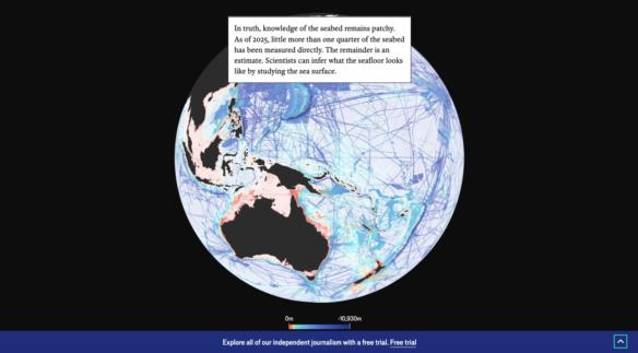 The article in The Economist that I mentioned above is excellent prose, as usual for The Economist, but it's also a wortk of art in a small way. Read it here: The Quest to Chart the Sea. It's an example of the technique where scrolling through an article updates an animation, known by the cloying name scrollytelling (here's the NYT article Snow Fall that started it all with an avalanche over a decade ago). Although The Economist article is behind a paywall, you get one free article a month (per browser!), so you should be able to read it. There are several maritime connections discussed, as you can imagine (but no celestial navigation). I'm including a few images from their scrollytelling...