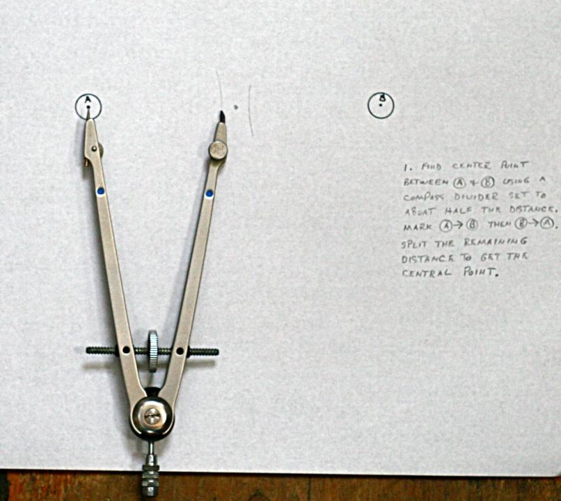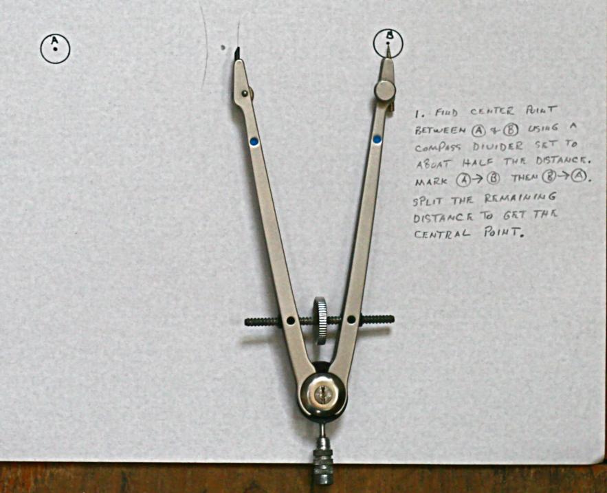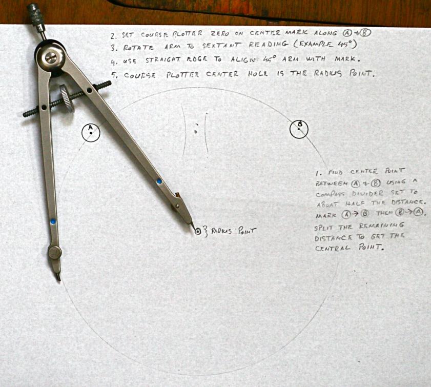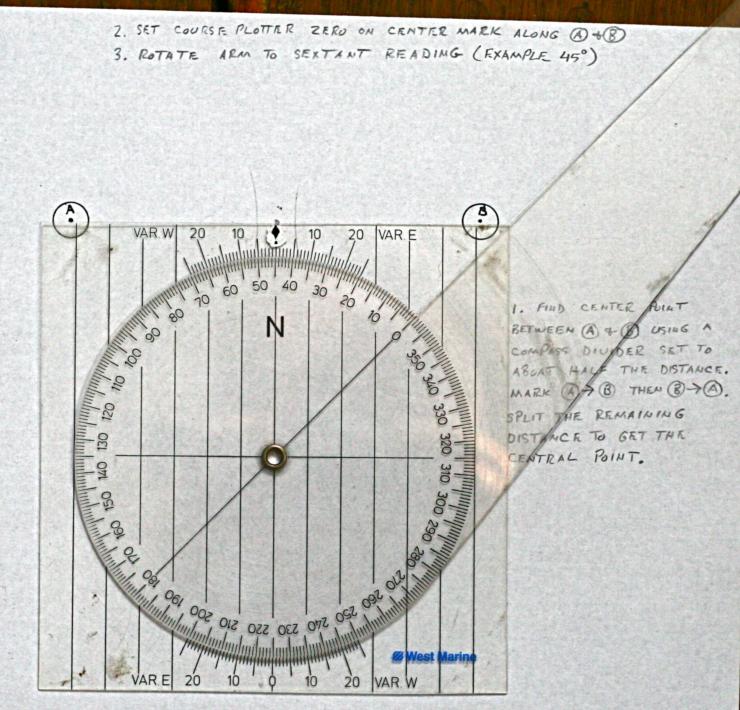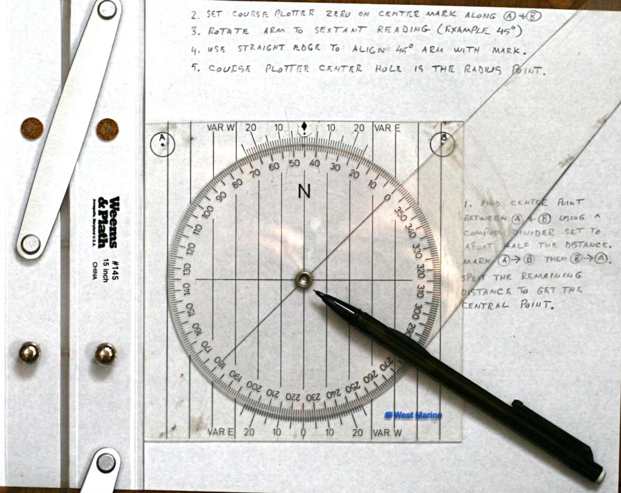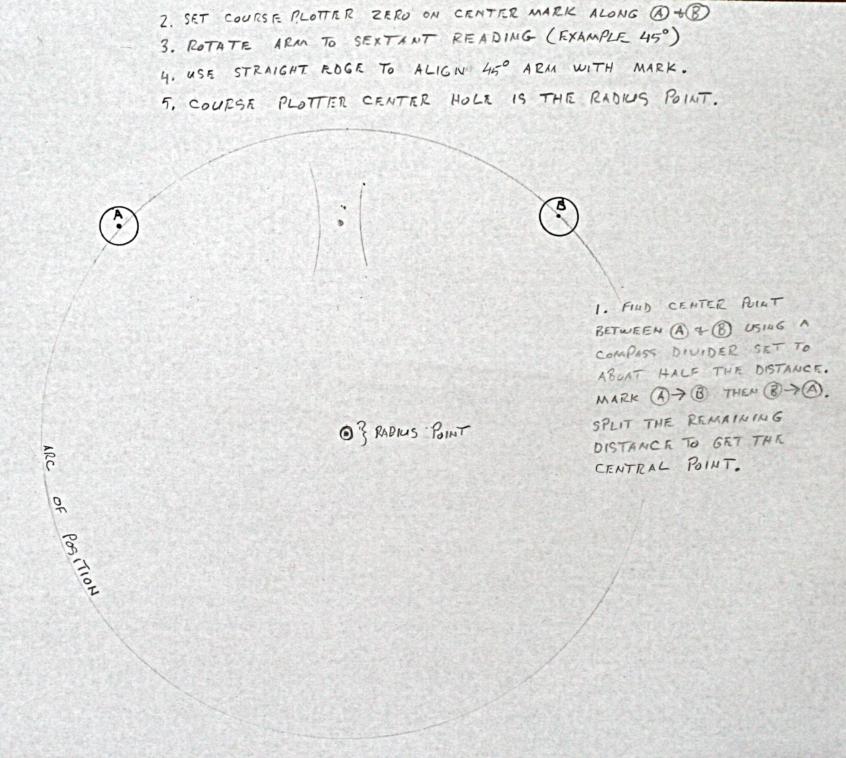 Linked are images of a 45° horizontal sextant angle plot using a course plotter, divider compass, and straight edge (parallel rule). The radius point on the chart is determined with the least amount of plot clutter. The center point between marks A and B can remain on the chart permanently for future plots. Only the arc of position near the course track DR needs to be plotted. This technique would be used when three fixed terrestrial navigation marks are not available for the three arm position pointer.