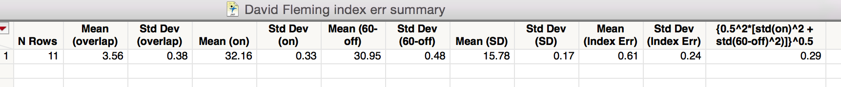 Attached is a summary of your data. The results are the same except that you did not multiply the variances by the square of one half. I did so in the last column of the attachment. The standard deviation of the raw index-error values once again is similar to the standard deviation computed from the individual on and (60-off) the arc measurements (last column). Both are smaller than the standard deviation of the overlap data, in disagreement with your hypothesis.
