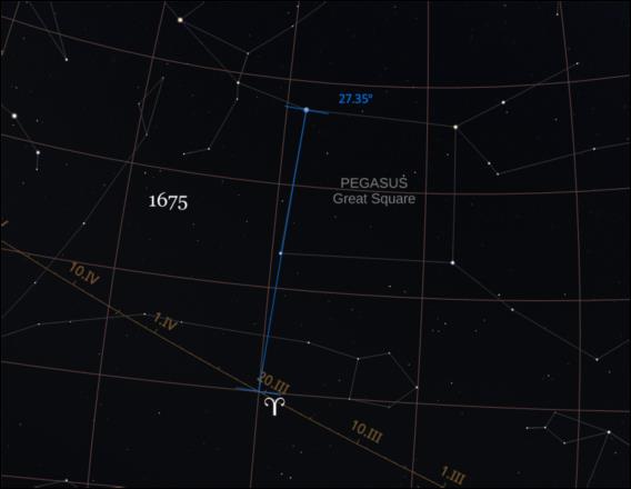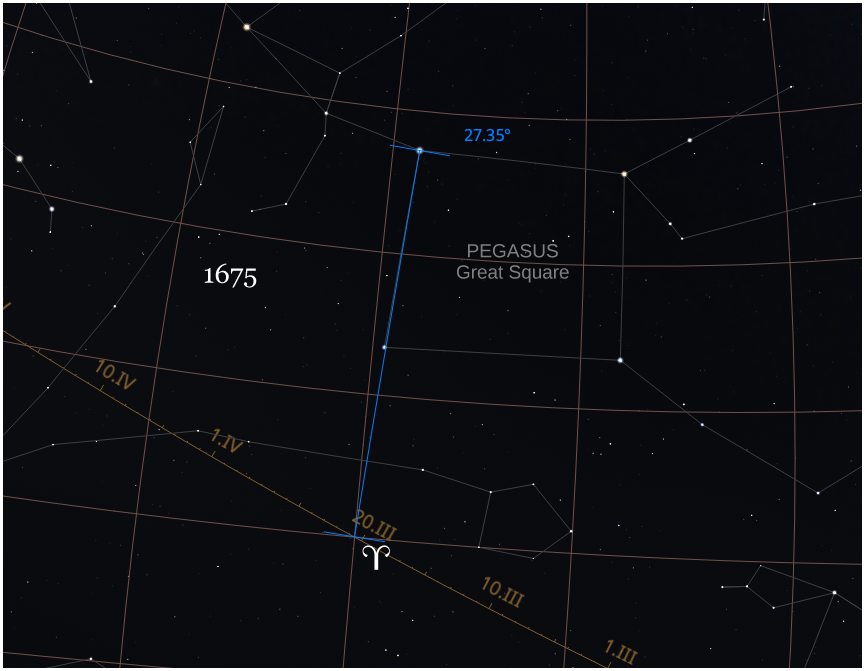It used to be easier to locate that fiducial point in the sky. If you looked up at the sky in... oh, let's August of 1675, just to pick a random month in the history of nautical astronomy... you would have had an easy trick for finding Aries. Go to the trailing edge of the Great Square of Pegasus. Draw a line from Alpheratz, at the north trailing corner of the Great Square through the south trailing corner. That length is 14°. Extend the straight line down toward the south almost that same length, and that will put you right at 0° Dec, 0° RA/SHA (within a degree, really close). This was no coincidence. It was by royal decree! When Charles II established the Royal Observatory at Greenwich that year, he also arranged to move the stars in the Great Square so that they would line up perfectly with that founding stone of celestial coordinates. ...It's good to be the king.