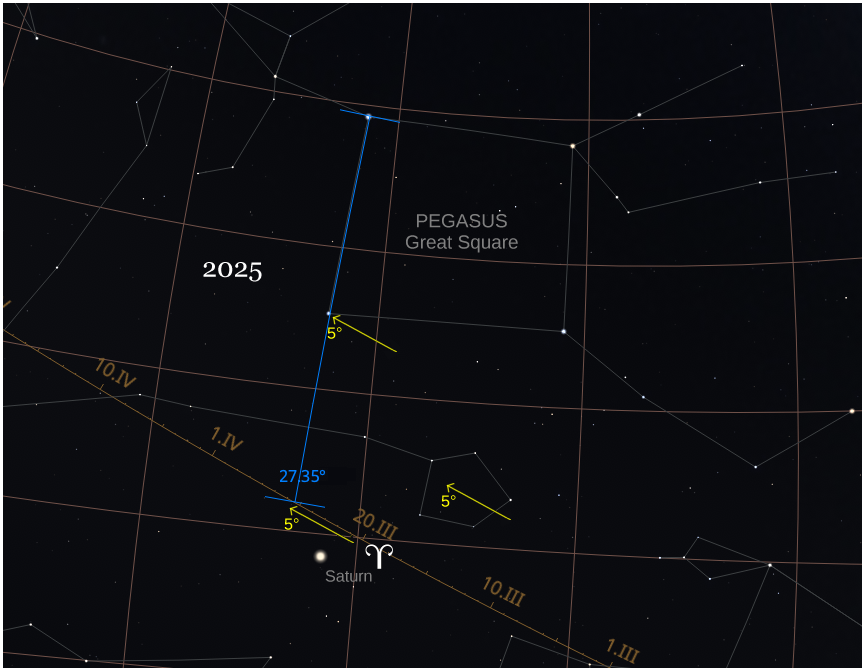 Now we move ahead 350 years. Last year was the 350th anniversary of the founding of the Greenwich Observatory, devoted to solving the problem of longitude. In those three and a half centuries, the Earth's axis has precessed. It amounts to just about 5° in 350 years. Precession, at the level of a very good approximation, is very simple when we look at the changing positions of the stars relative to the ecliptic. The celestial sphere is simply (approximately) rotating about the axis perpendicular to the ecliptic, about the ecliptic poles, so the stars appear to slide across the sky, through the RA/Dec coordinate grid, on paths parallel to the ecliptic. That means that the line through the trailing side of the Great Square no longer points at the Aries point. Instead it points, at the same distance, a little less than 28°, to a spot just five degrees up the ecliptic, in the same direction that the little constellation of Aries has moved over the centuries. Or to turn it around that key crossing point in celestial coordinates is drifting down the ecliptic and has shifted by 5° away from the constellation Aries in the 350 years since this nice Great Square trick worked so well.
