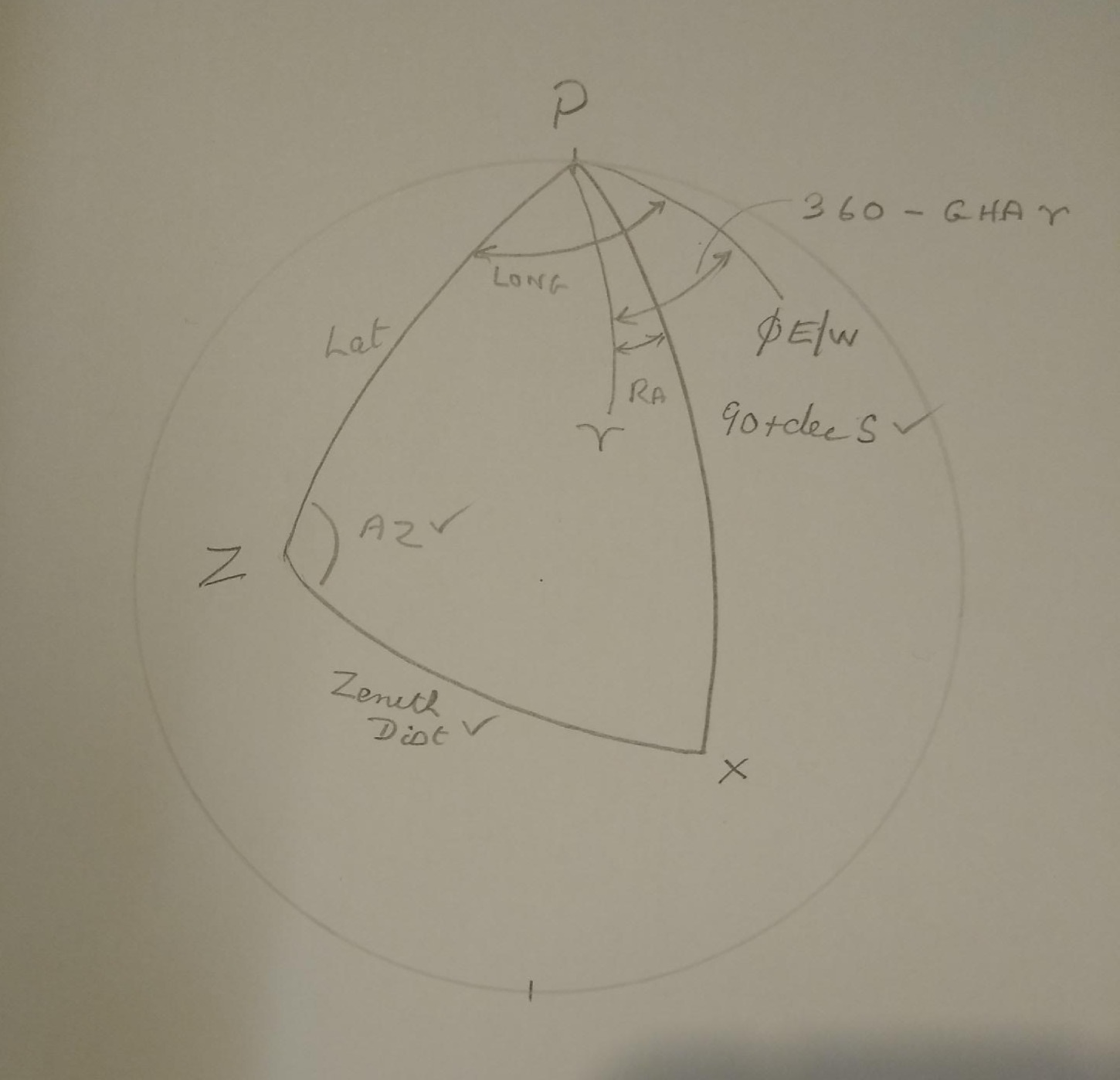 Oops. You get angle P first from the sperical sine rule. Then latitude from two sides and two angles. DaveP