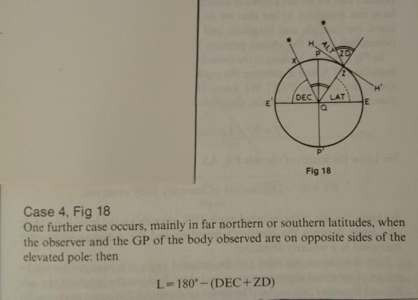 Joshua Carty. If you were wondering where I dreamt up Lat = 180-(Dec+ZD) from when the star and the observer are on opposite sides of the elevated Pole, please see the photograph below, which comes from Mary Blewitt’s ‘CELESTIAL navigation for yachtsmen’ 12th EDITION 1977 p23. As you will see from others’ more complete results, close to meridian passage you’re safe with latitude, as seamen have known using latitude sticks and the likes for over 1,000 years. Using a single max or min altitude estimate to obtain longitude requires a lot of luck, even with an accurate chronometer. DaveP