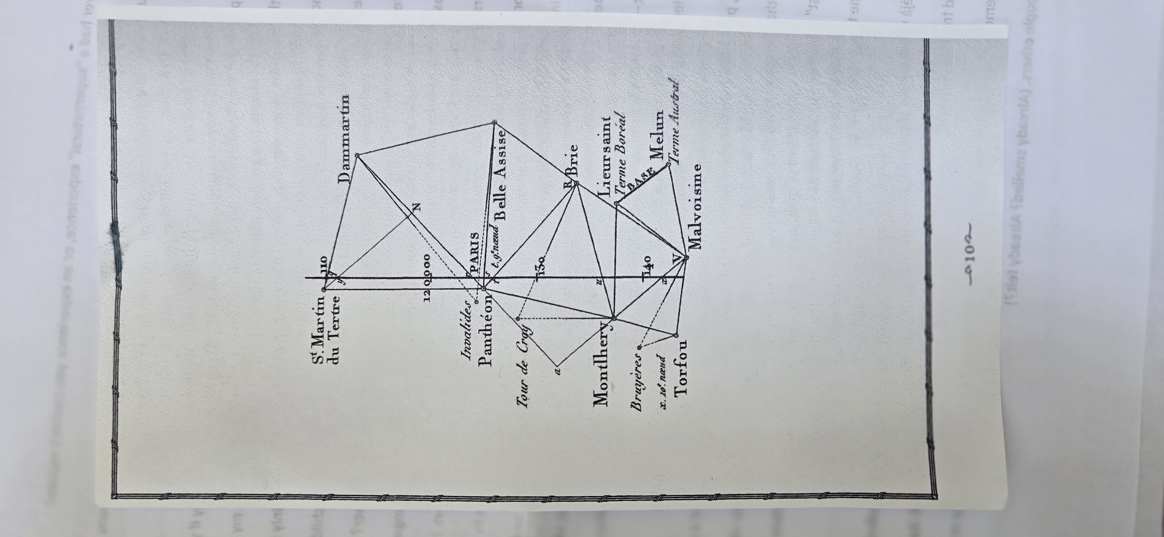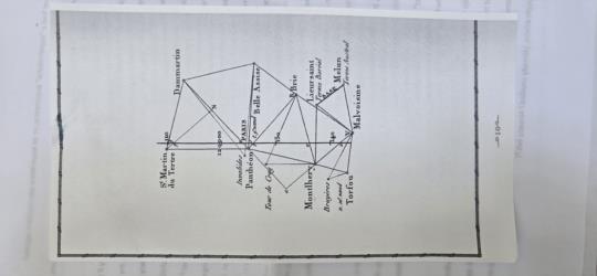 The length of the meter calculated by Delanbre and Mechain is "roughly" 0.2 millimeters short. The attached figure was used in 1740 to derive this length by calculating the length of the meridian that runs through Paris from the North pole to the equator. They used the triangulation method and simple trigonometry. But how was the length of any segment on the figure calculated from the series of triangles (extrapolating from the physically measured base line)? How, for instance, was the distance between t and u derived?