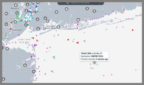 That monster vessel left yesterday morning. I saw it shifting its cranes around at 10pm the previous night (easy to see thanks to its brilliant lights), but I was surprised to see that it has already moved to its working location (see chart from marinetraffic below). It's now south of Long Island, building the Empire Wind project.