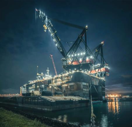 A few days ago, a giant "ship" arrived in Newport harbor. It's the Thialf, and it's "huge". I put "ship" in quotes since it's a self-propelled construction platform with two enormous cranes. It's presumably here to work on the large wind power projects south of here. These projects looked likely to be cancelled by the Trump Administration, but that hasn't happened so apparently money is flowing again. Wikipedia has an article on Thialf, emphasizing its giant size, and there are a few photos. This "ship" is presently anchored (?) one nautical mile away from me, but it seems like it's much closer --like a quarter of a mile-- since the scale is hard to comprehend. I also found a photo on marinetraffic.com showing it lit up at night, which I'm including below. It's ridiculous. It's the brightest thing for maybe twenty or thirty miles around... Las Vegas in my backyard...