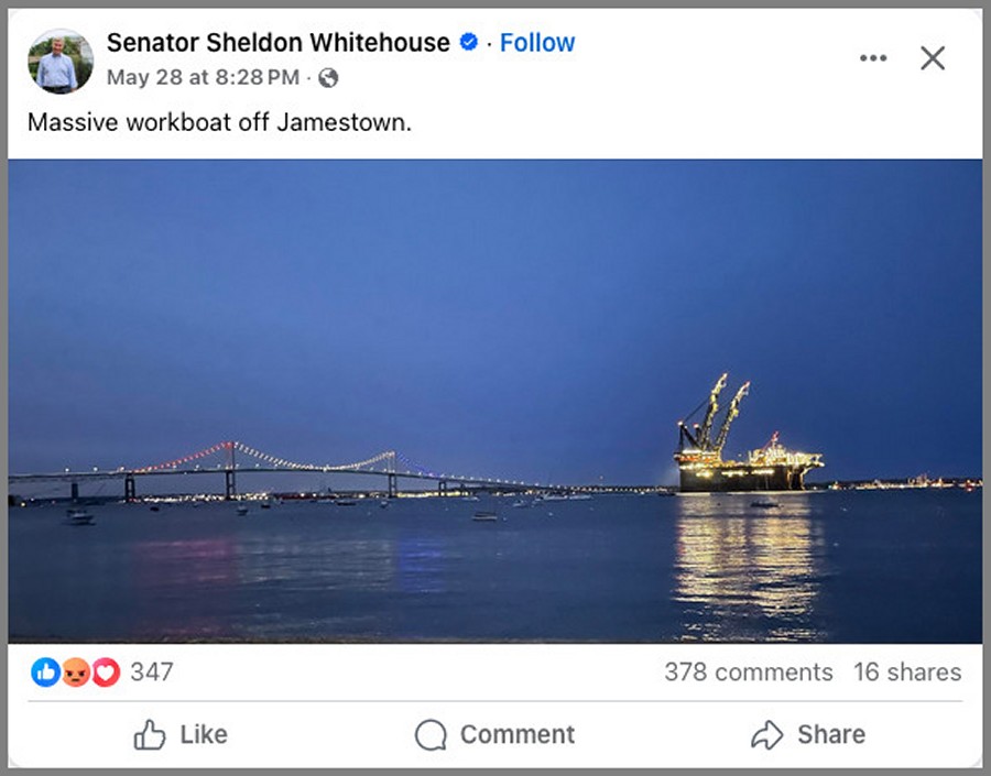 I saw this on Facebook a few minutes ago. It's been all over the Rhode Island local and regional news, but it's a bit amazing to see a US Senator take note of it... accompanied by a photo that specifically displays the insane light show it produces, though only hinting at the overwhelming brightness.