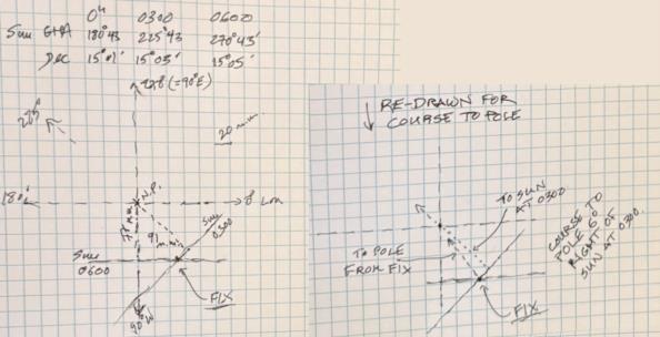 If the chronometer is wrong, this simply rotates the entire plot at the rate of 15° per hour. This has almost no impact on our distance from the pole except that our estimate of the Sun's Dec might be wrong by a mile or two. This is almost certainly less concern than the quality of the sextant sights. As for the direction to the pole, that is directly indicated on the plot! Any uncertainty in azimuth (longitude here) disappears if we measure the direction to the pole relative to the direction of the Sun at the time of the first sight. And to "store" that direction, we put drive two ski poles into the snow and ice when we take the first Sun sight aligned along that direction. We read off the direction with ease from the plot (see the lower half of my example plot) and then reference it to the direction to the Sun at 0300 stored by the two ski poles. And that's it. We have 92 miles to go, on a course about 6° to the right of the Sun's direction at 0300 watch time... Mush!