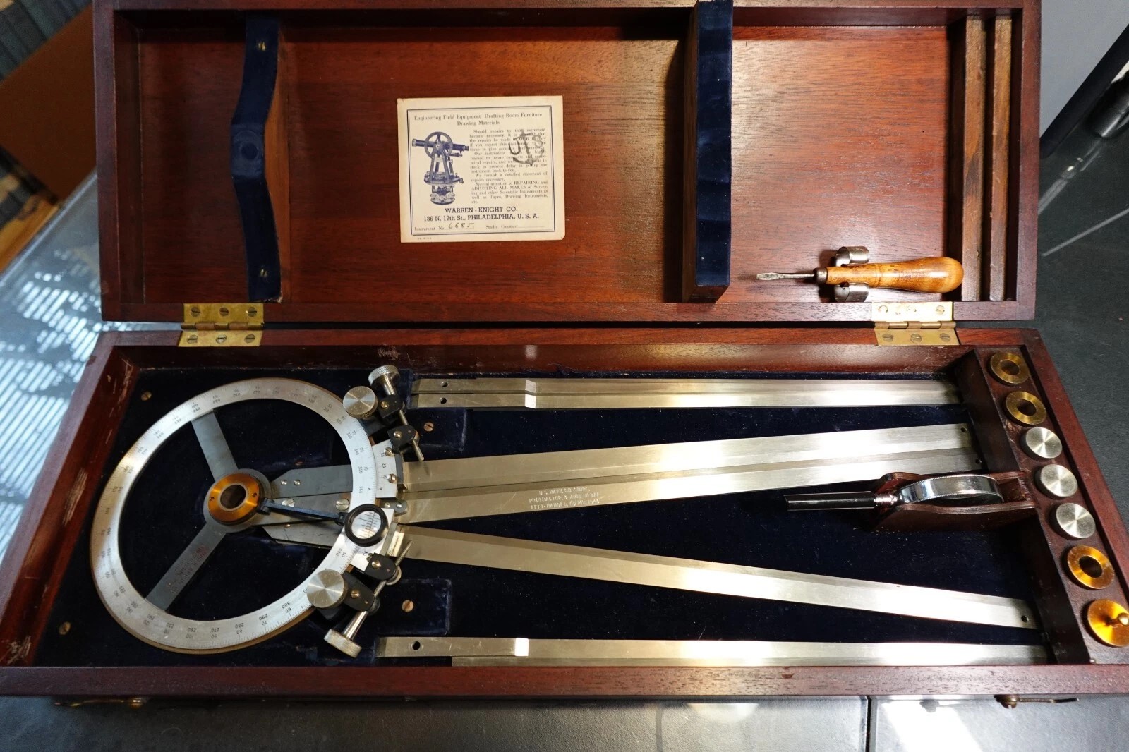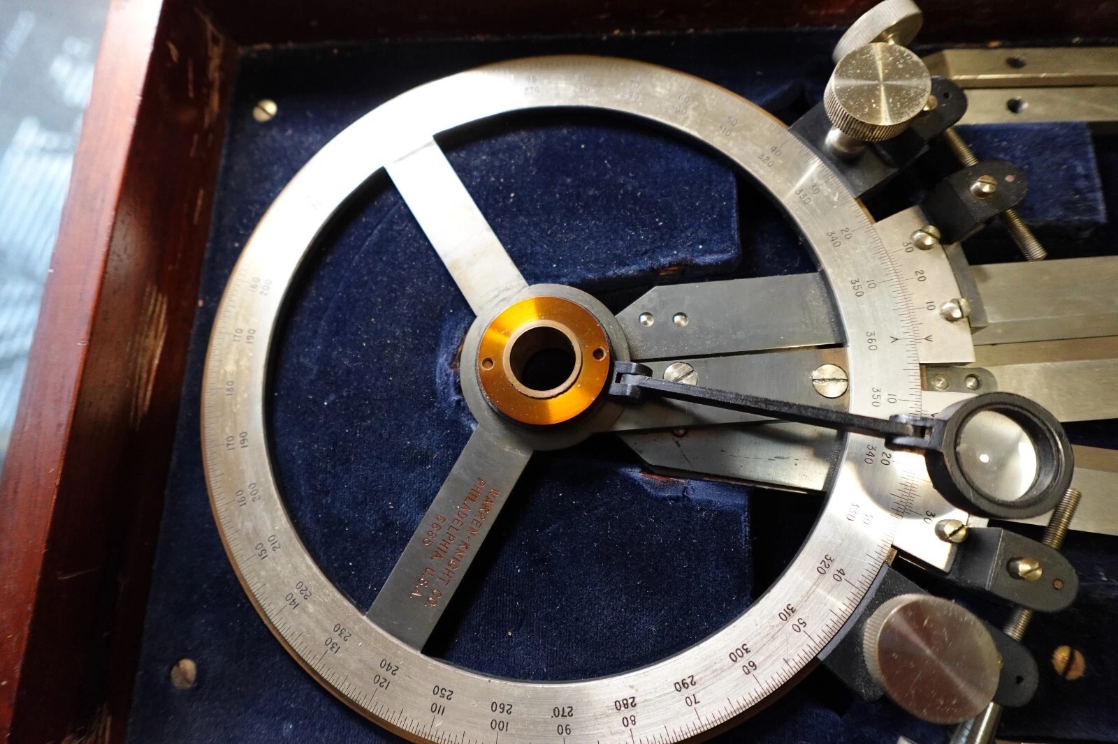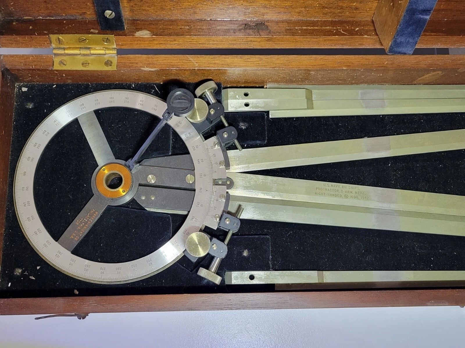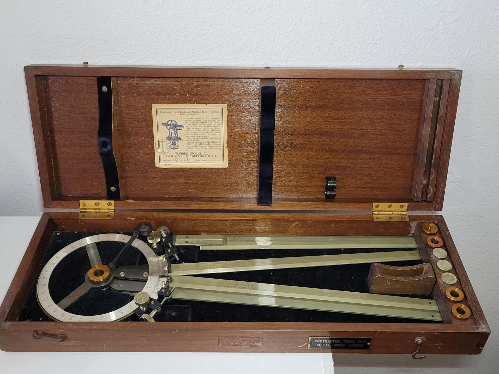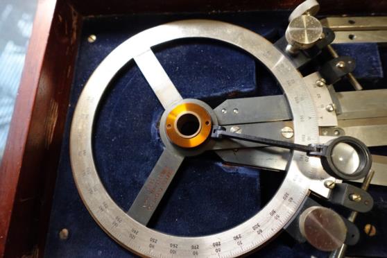 Thanks for responding with pics of your instrument. Here are pics of Left-Handed and Right-Handed version of the older (1940's) Warren-Knight instruments I was looking at. I think what you have would be what Warren-Knight would describe as "left-handed," meaning that if you held the instrument with the legs pointing away from you, only the center and left legs are capable of being closed together, i.e. 0 degrees, whereas the center and right legs can only close to about 2-3 degress. I agree, that is not much of a difference. On the older Warren-Knight instruments, the pair that can't completely close can only close to around 11-12 degrees. Guessing the reason they can't close as much as yours can has to do with the Warren-Knight instruments using a vernier scale instead of a micrometer drum. Just speculating, but maybe this is just as simple as "you had to have both in case there was a tighter angle in play than one or the other version could handle?"