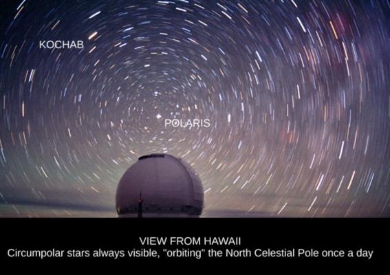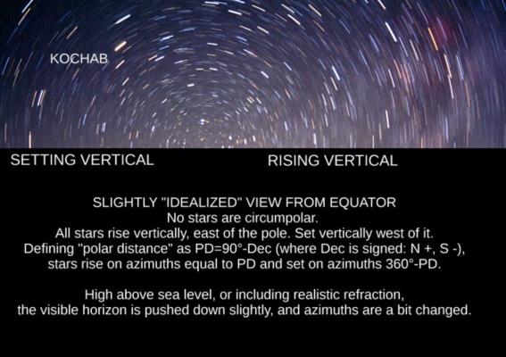 If we take a standard image of circumpolar star trails and cut it so that a horizon line neatly bisects the image at the pole, we are seeing the idealized view from the equator, and it's very close to what real observers would see, too. But we can ask how this would change in real world cases that are not idealized. For example, suppose we are flying above the equator at 40,000 feet. The dip in minutes of arc is then very nearly equal to the square root of the height so that gives 200' or, equivalently, 3° 20'. That's quite a lot and certainly visible from that altitude by looking at the north and south visible horizons on a dark night. Even from exactly along the equator, Polaris would be significantly, observably above the horizon at all times when flying at 40,000 feet. We would get another 5-10 minutes of arc increase in altitude from refraction. Given the small p.d. of Polaris (around 40'), the observable altitude of Polaris above the so-called "visible horizon" (though not literally visible at that altitude would range from a bit more than 4° to about 3°, and it would never set! Other stars would have modest "arcs" of their circumpolar paths visible so the rising and setting locations would shift slightly. This is where the "approximation" mentioned by Martin in his earlier post would come into play.