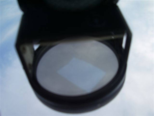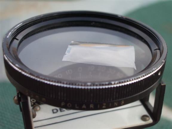 I balanced the polarizing camera filter on top of the sighting vanes one the astrocompass. I cut out a piece of cellophane and put it on top of the filter. I put a small mirror on the base of the astrocompass to allow me to look up though the filter at the zenith. I had to try different alignments of the cellophane to maximize the zenith light shift affect. See attched images.
