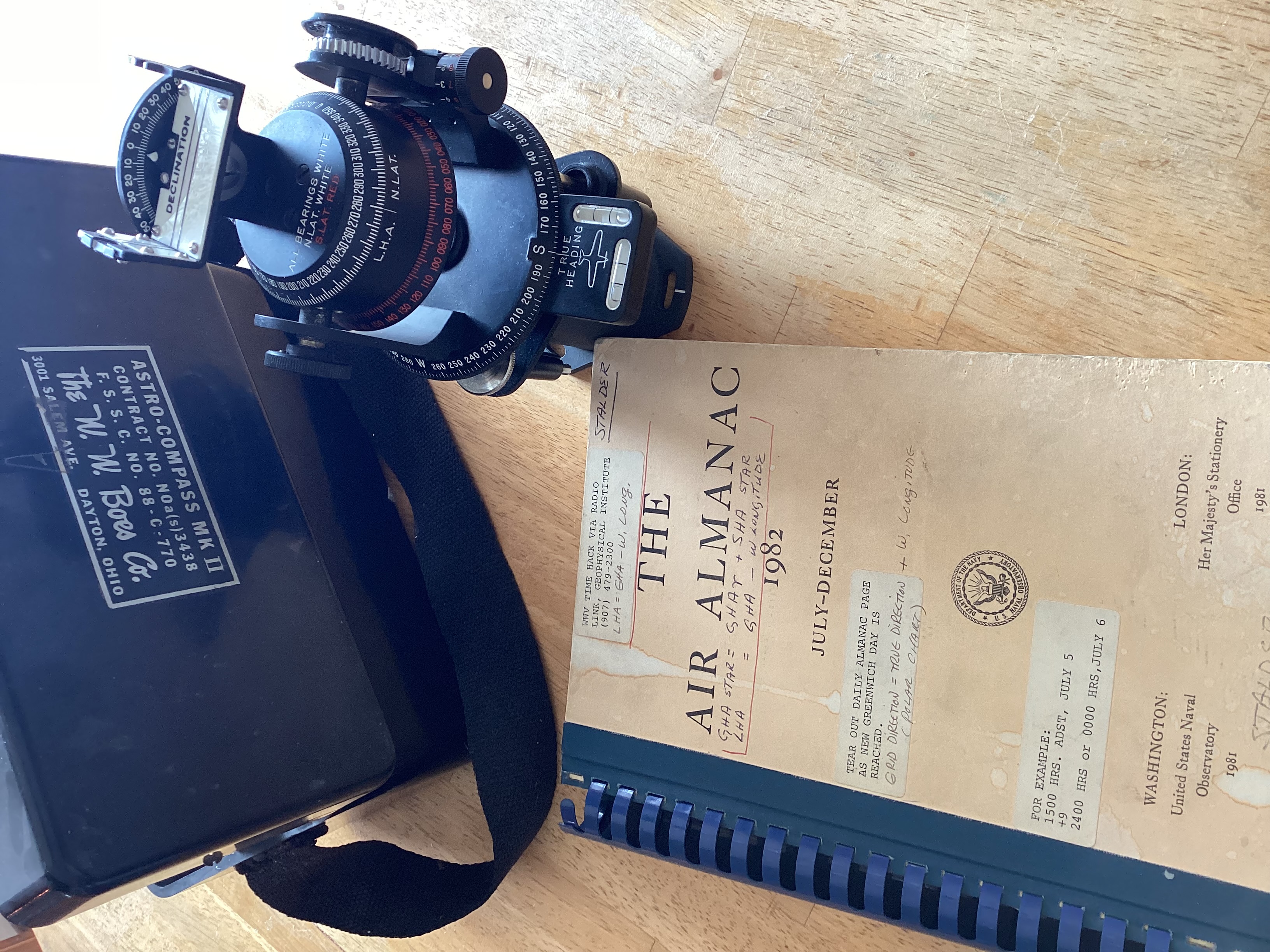 The heading to set into the cockpit gyros to was derived by using the Astro Compass. There is no astrodome in a Twin Otter, so the Astro Compass was usually used out one of the side windows or the windshield. These Astro Compasses had a specific mount, and I still have one, but there was really nowhere good in the cockpit to affix it. We did rig up a couple ersatz mounts, but I was never really thrilled with them.