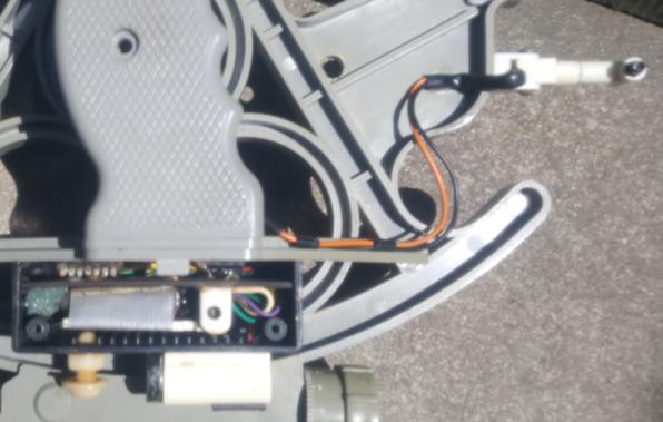 The black box is an electronics project box cut in half and glued to the sextant. In the center of the box, covered by the duct tape is a 2-way Mercury switch mounted on a swing platform. On the lower left of the box is a nylon adjusting screw to fine tune the angle of the Mercury switch. In the upper left of the box is a flip-flop chip so that the light is on when the Mercury switch is off. On the lower right of the box is a slide switch and potentiometer for on/off/brightness control.