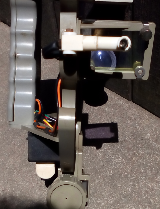 On the right of the photo is the light boom. This came from an "Itty-Bitty Book Light" as did the slide switch and potentiometer . The book light was a white LED, so I replaced that with a red LED. To deploy this boom, just swing it 90 degrees so that it is squarely in front of the Horizon mirror.