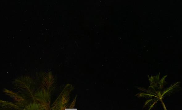 Here's a view above some palm trees from an episode of a travelogue series called "The Reluctant Traveler" which has comedian Eugene Levy visiting various countries around the world... really roughing it in opulent resorts. I watched part of an episode tonight. There's a view of the night sky, image attached below, that's nice for what it shows, and also a bit sad for what it's missing.