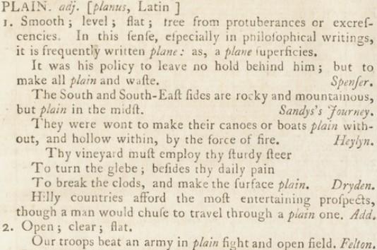 The 1773 edition covers "plain" very well. I attach a screenshot of the first three definitions in the list.