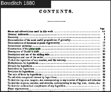We (NavList community) have a list of Bowditch editions and other historical works here. This includes local links to PDFs, and also external links to Google Books, archive.org, and a few other sources. I'm attaching screen captures of the Contents pages of the 1802 and 1880 editions/printings of Bowditch's 'Navigator'. Plane scales in 1880?! Wow! And look at all that material on lunars!! Who said lunars were over and done by about 1850 anyway (that would be me)?! But no, it's misleading... all we're seeing here is a book that is largely frozen in time.