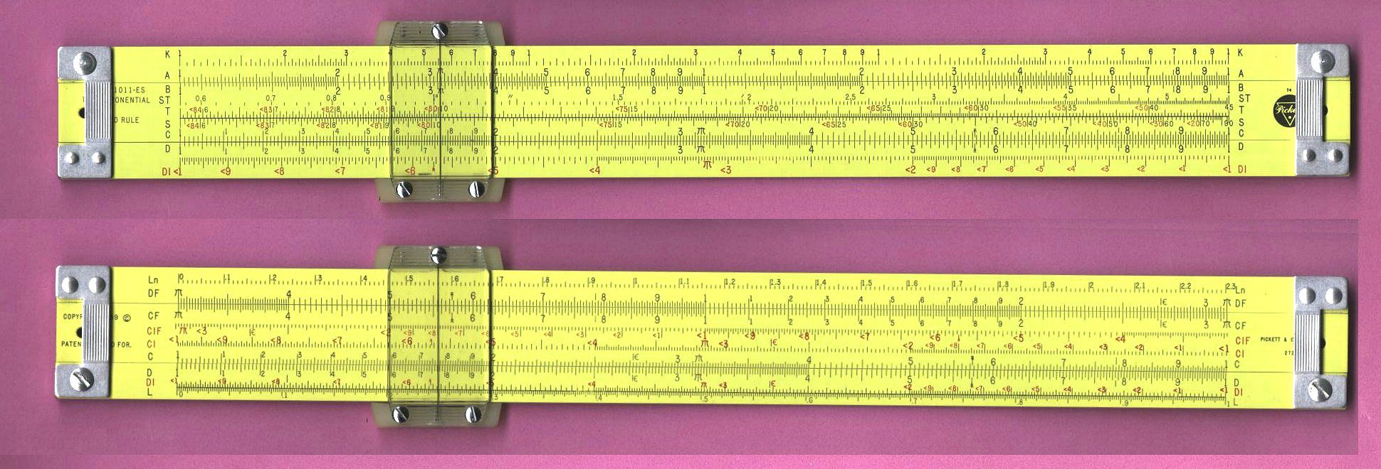 I bought another slide rule recently. A Pickett 1011-ES with a heavy-duty case, both in near perfect condition. I was just trying some DR calculations on it and I noticed two gauge marks that I don't understand. On the "ST" scale, there is an arcsecond gauge mark at about 1.18 and an arcminute gauge mark at about 1.97 (both are visible in the picture linked above). After some searching, I found this description of the marks: