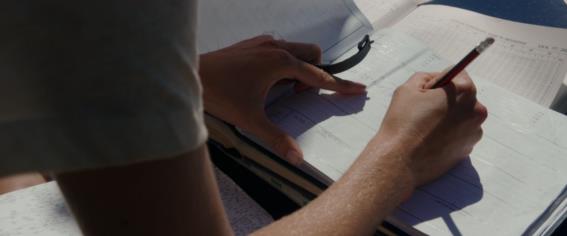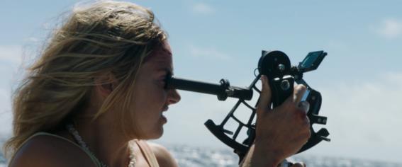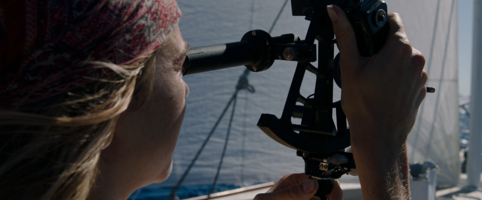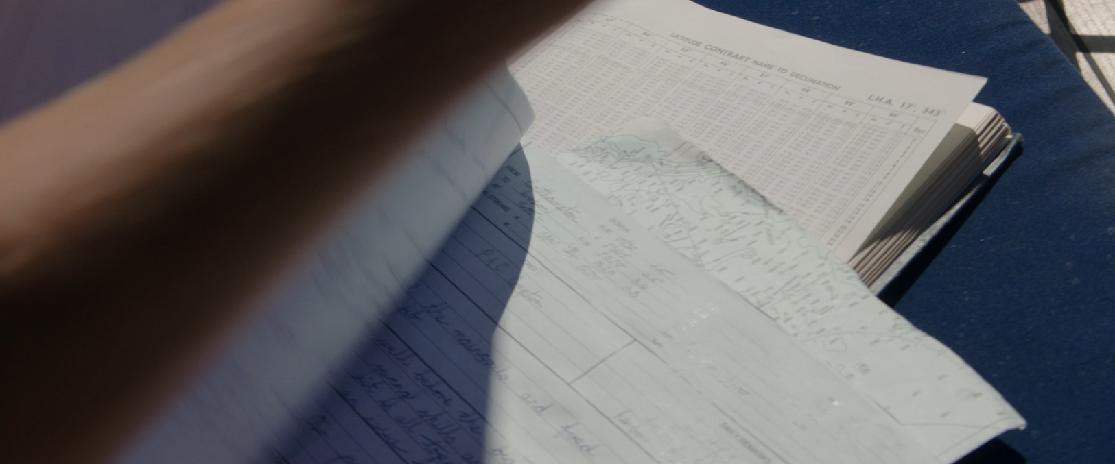 In film theory, "show, don't tell" is a fundamental principle. Show it through visuals, actions, sounds, and all that "film stuff" rather than stating plot points directly through dialogue or narration. Eschew explication! On the other hand "show your paperwork" is never a good idea in a film. Pencil and paper calculations lack excitement. They are bereft of drama. They scream "dullsville"! There were some hints of celestial navigation calculations in "All Is Lost" which served a dramatic purpose of demonstrating the mundane tasks that could bring "Our Man" back from the brink after he lost his boat and symbolically his liefe. In these screen captures from another recent film, we see a navigator in the Pacific taking Sun sights and also some hints of the paperwork required to get the latitude and longitude. The film is based on a real sailing tragedy in the pre-GPS era. Here's a challenge: Name that film. I offer no more hints than the screen captures... no more hints than the screen captures! Challenge two: what sextant is that? What make and model? Challenge three: If you have made it this far, then for a more amusing challenge, deep in the abyss of geeky nitpicking :), see if you can decide whether the pages open in the sight reduction tables make sense for the setting! I think that's H.O. 229 that she's using, but I didn't look too closely...