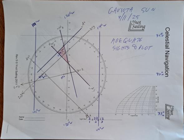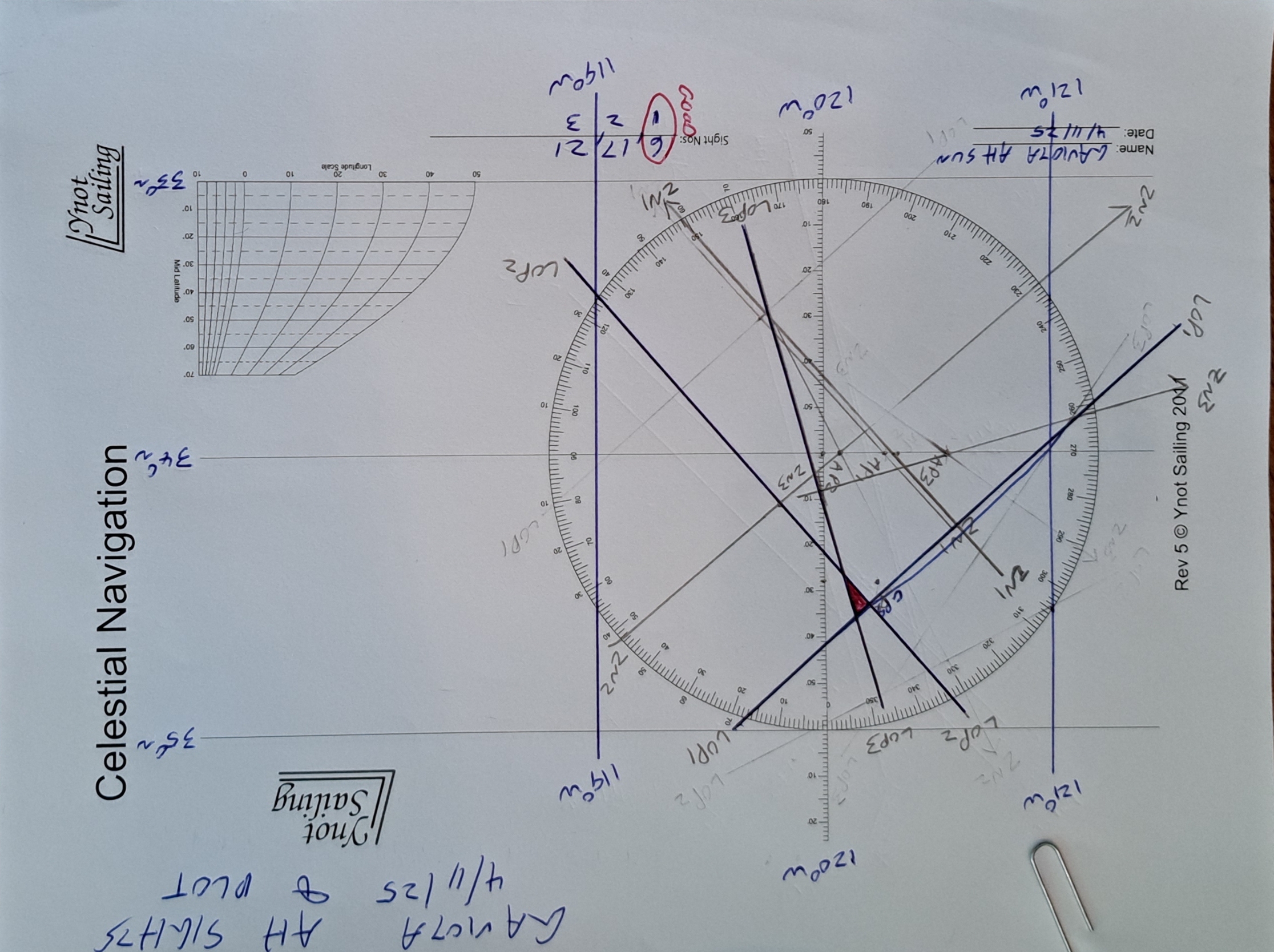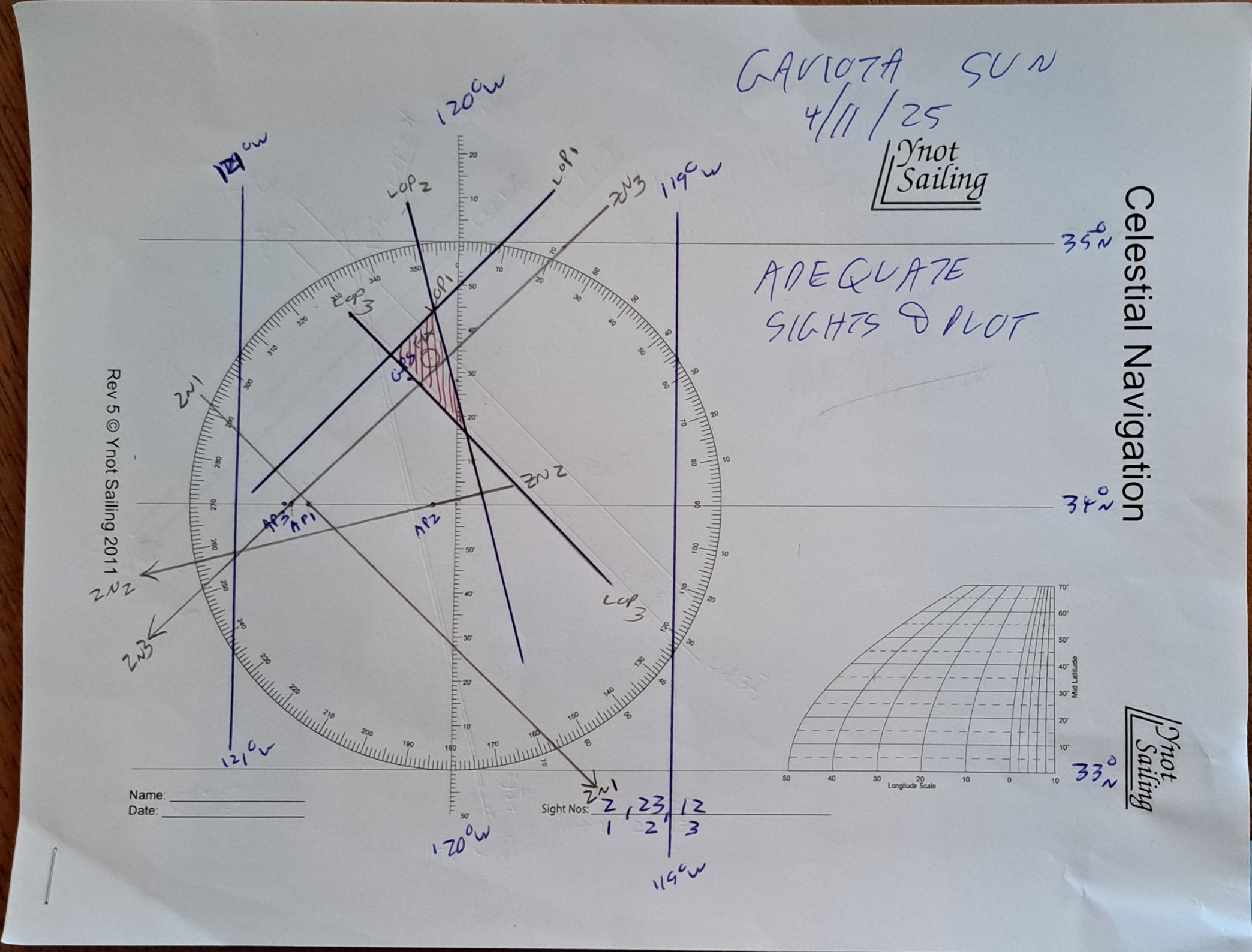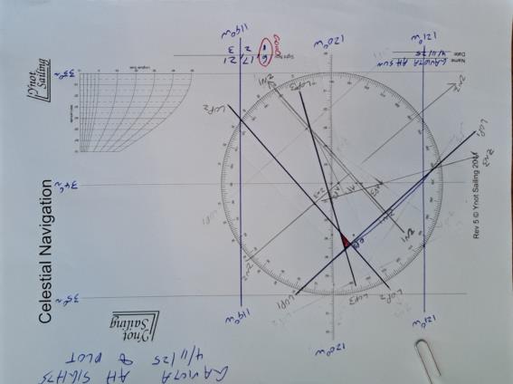 I just finished plotting 3 each of my direct sun sights and AH sights, and after correcting several simple calculation errors, got my fixes within about 5 and 10 miles, respectively. (Maybe someone might be interested in seeing the plots so they're attached.)