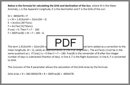 Attached below is an update of a simple method to calculate the GHA and declination of the Sun using two parameters specific to the year. We have included values of the parameters for the years 2025 through 2040. These calculations are quite practical using an inexpensive scientific calculator- less than $10 on Amazon - and are more than accurate enough for small boat navigation. Such a calculator also makes quick work of the formulas for solving the Navigational Triangle, so this approach can replace annual Nautical Almanacs and volumes of tables for working up Sun lines.