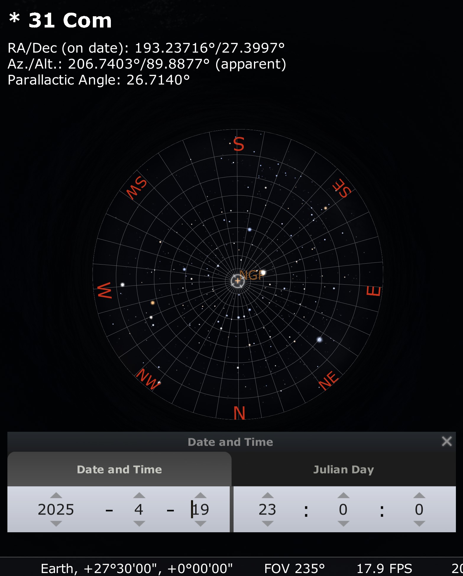 Heh. Yeah. It can be a little disconcerting! The ideal location and time, where the Milky Way is running around the horizon this time of year, puts the North Galactic Pole at the zenith. In "Stellarium", you can turn on an indicator to display the NGP. Can you get that to display in the web app version of "Stellarium"? In the desktop version, it's under the "Sky and Viewing Options window" (accessible from the left-side palette of controls) and then under the "Markings" tab. You have to look carefully among the many options for "Galactic Poles". Tick the checkbox, and that marker should appear.
