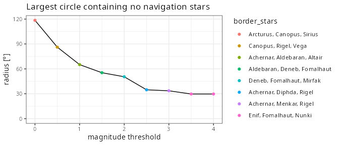 In any case, this plot shows that the radius of the unlucky circle goes from 30° (no magnitude threshold) to about 120° at magnitude threshold of 0, and it also gives the three border stars between which the empty circle lies.