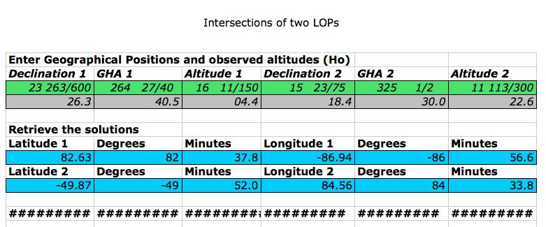 Using Lars's observed altitudes (and GP's from Navigation Spreadsheets) I calculate the relevant intersection of the two LOPs to be at: