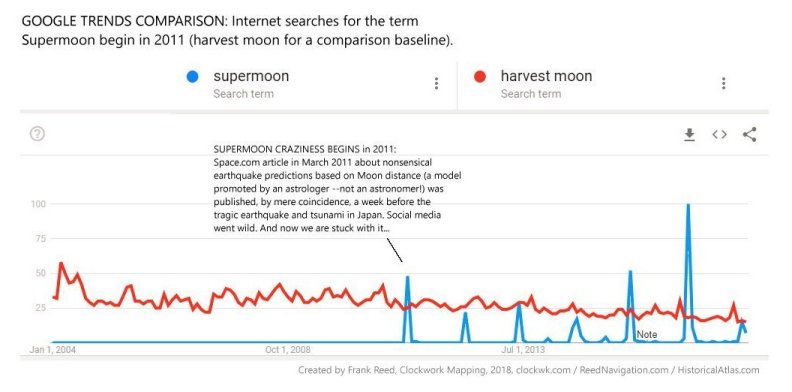 Most folks don't realize that "supermoon" has only been a topic of conversation for seven years. The expression was coined decades ago by an astrologer who thought he could predict major earthquakes, but this concept was rightly ignored as nonsense. Then space.com published an article about his pseudoscience which, by pure coincidence, came out just a week before the tragic earthquake in Japan. Social media went crazy, and the rest is history. Here's a Google Trends comparison...