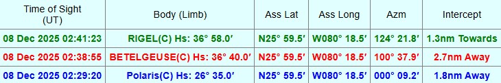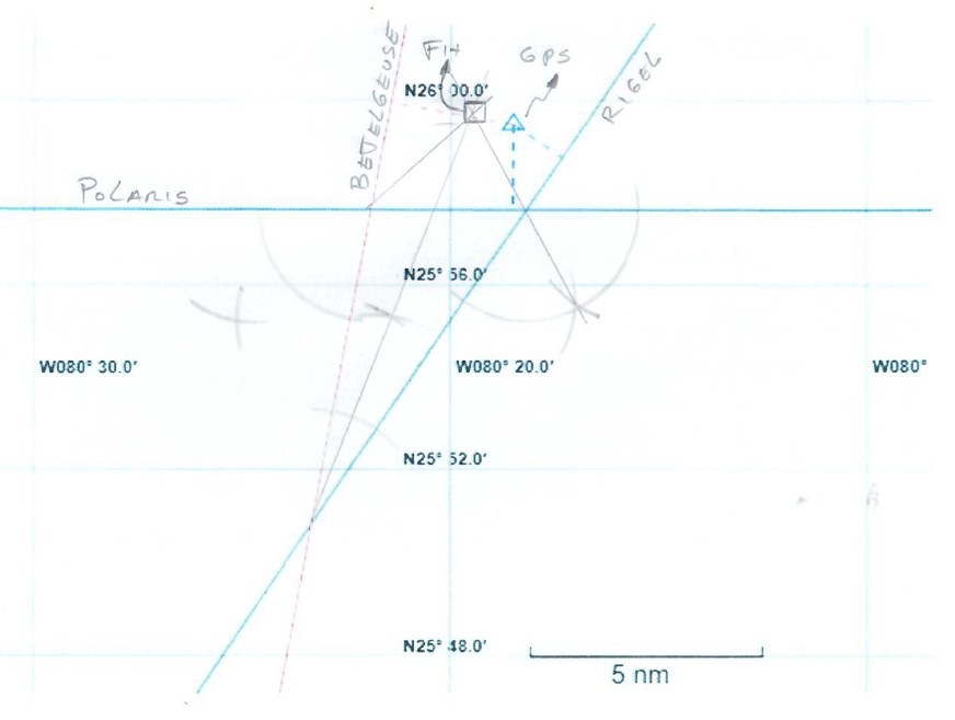 I am based in Miami, Florida so there were several stars to shot yesterday evening. Due to the small angular separation between Rigel and Betelgeuse, in normal circumstances I would not have taken both of them, but the LOP's of those two plus the one from Polaris formed a thin triangle quite similar to the one on the discussion.